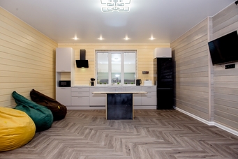 Большая комната с диваном и кухней. Проведите здесь второй день свадьбы, "мальчишник" или "покерный турнир". Сможет разместиться большая компания, и всем хватит места.